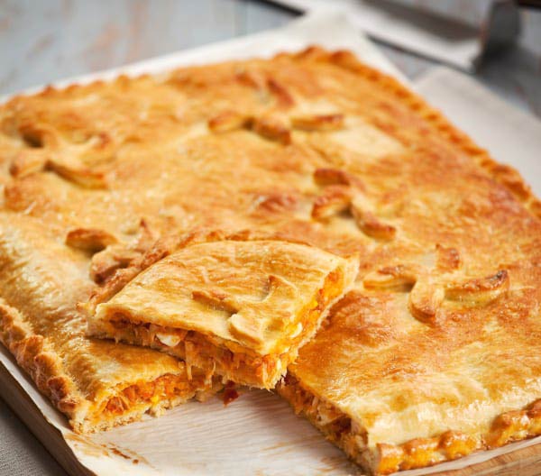 Colóquela sobre la bandeja del horno preparada. Vierta el relleno encima y extiéndalo dejando libre un borde de 2 cm. Con el rodillo, extienda la otra mitad de la masa.Pincele el borde de la masa inferior con agua. Cubra el relleno con la segunda porción de masa. Recorte y selle los bordes y, con los recortes de masa, decore la superficie. Haga un orificio o corte en el centro para que salga el vapor. Pinte con huevo batido y hornee a 200ºC durante 30 minutos aproximadamente. Sirva caliente o fría.