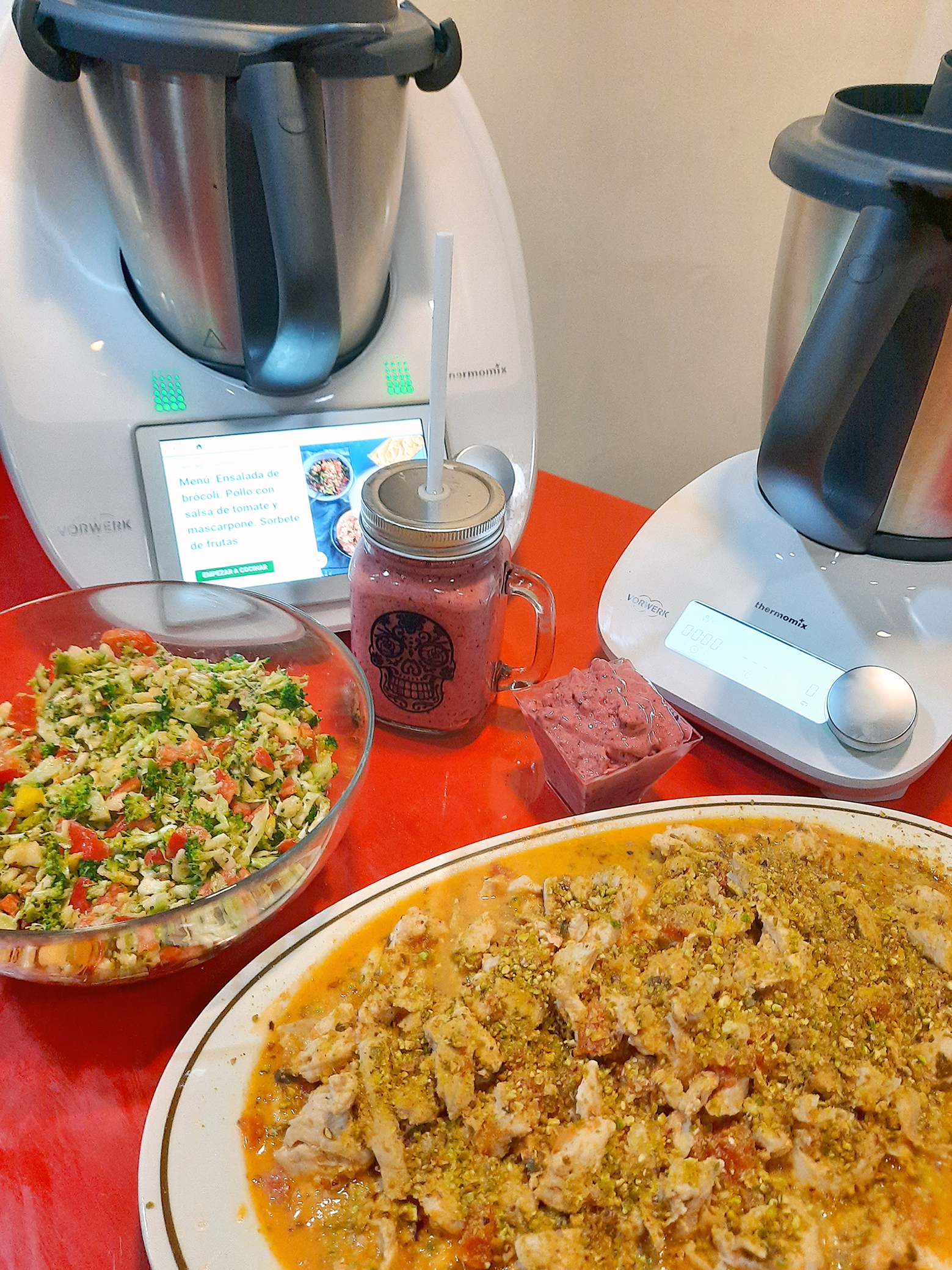 Menú: Ensalada de brócoli. Pollo con salsa de tomate y mascarpone. Sorbete de frutas