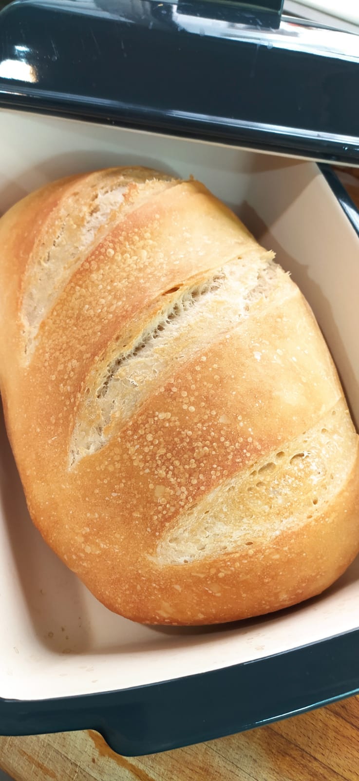 - Con ayuda de un cuchillo corte ligeramente la superficie haciendo una cruz y rocíe un poco de agua sobre la masa. Hornee por 30 minutos (200°C) luego retire la tapa y hornee nuevamente por 10-15 minutos (200°C) o hasta que haya dorado la superficie.