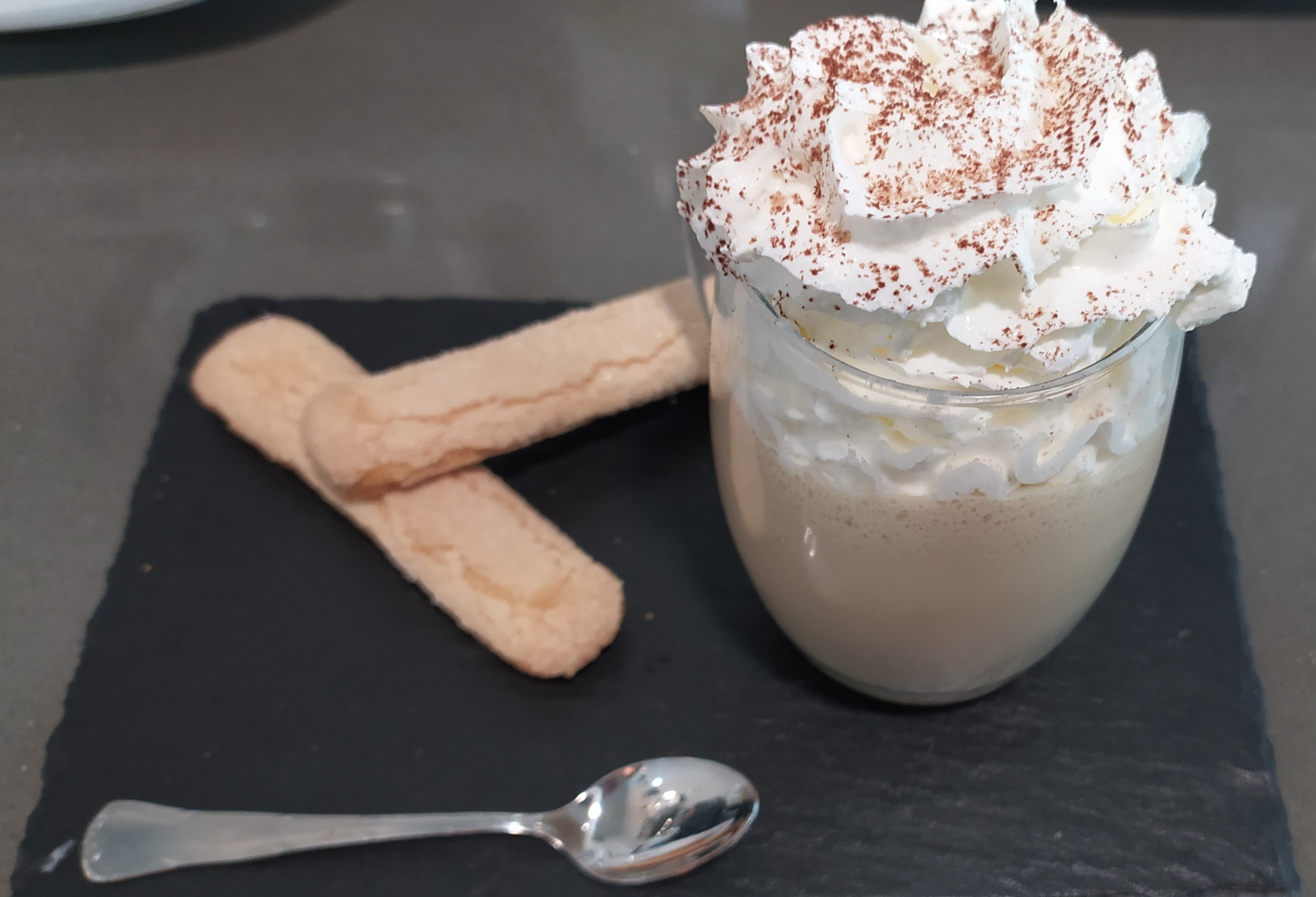 3. Servir con la nata montada, un bizcocho y un poco de cacao