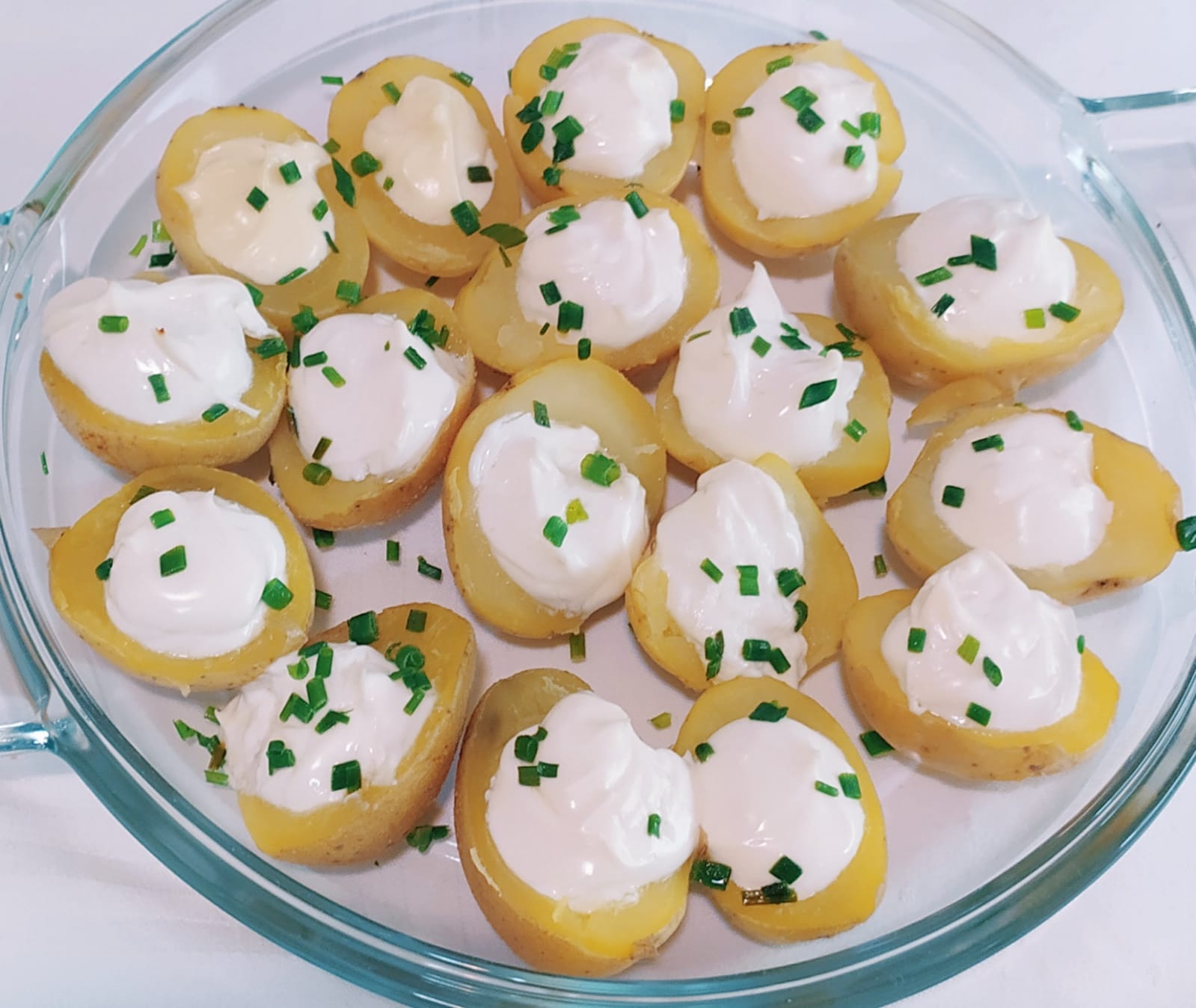 - Corte el cebollino para poner un poco encima de cada patata para decorar.