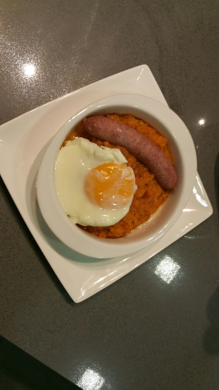 - Sirva las longanizas con la calabaza en ajillo y coloque en cada plato un huevo poché.