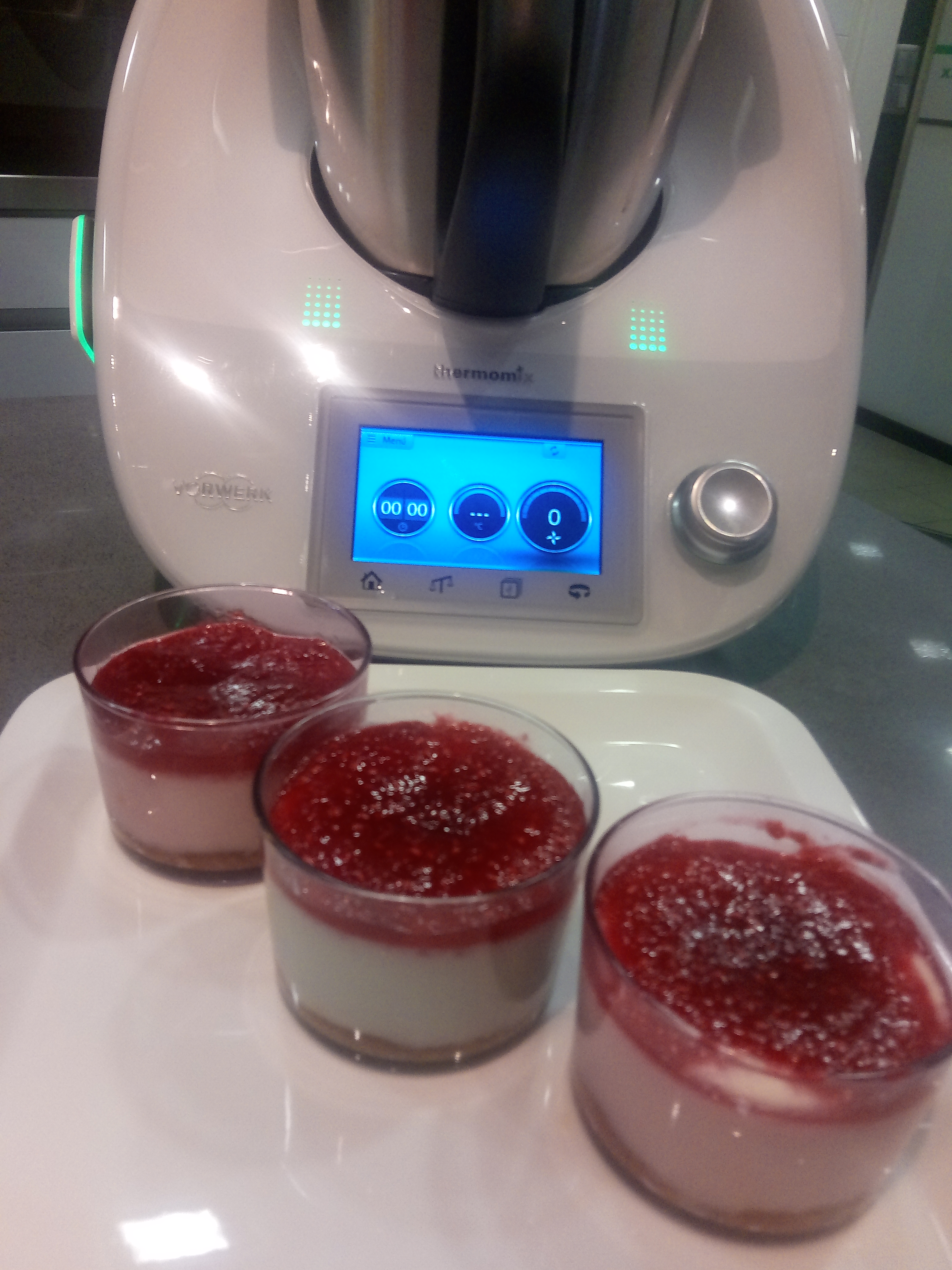 - Ponga en el vaso los frutos rojos y el azúcar y programe 11 min/100°C/vel 1. Cubra cada cheesecake con 2 cucharadas de esta mezcla. Deje enfriar los cheesecakes por completo, reserve en el frigorífico durante al menos 2 horas y sirva fríos.