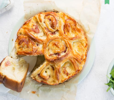 2. Con un rodillo, extienda la masa dándole forma rectangular (aprox. 30x40 cm). Cubra la superficie con las lonchas de jamón serrano y de queso y reparta la mantequilla. Forme un rollo comenzando por la parte más ancha. Corte en 8-9 rodajas y colóquelas en el molde preparado. Pincele la superficie con huevo batido.