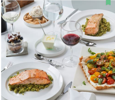 21. Sirva el Dip cremoso de jamón y el Ajoblanco de avellana con compota de manzana de aperitivo. La Tarta de tres quesos y tomates cherry de entrante. El Salmón a la naranja con cuscús de brócoli de plato principal y el Brownie con crema de mascarpone y frutos rojos de postre.