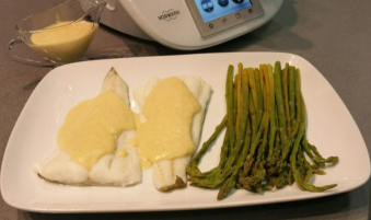 - Incorpore al vaso la maicena y programe 1 min/100°C/vel 1. Sirva los lomos de bacalao regados con la salsa y acompañado de los espárragos.