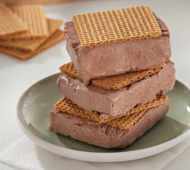 3. Desmolde la barra de helado y, con un cuchillo mojado en agua caliente, corte 8 porciones. Ponga una galleta a cada lado de la porción de helado formando un sándwich. Sirva inmediatamente.