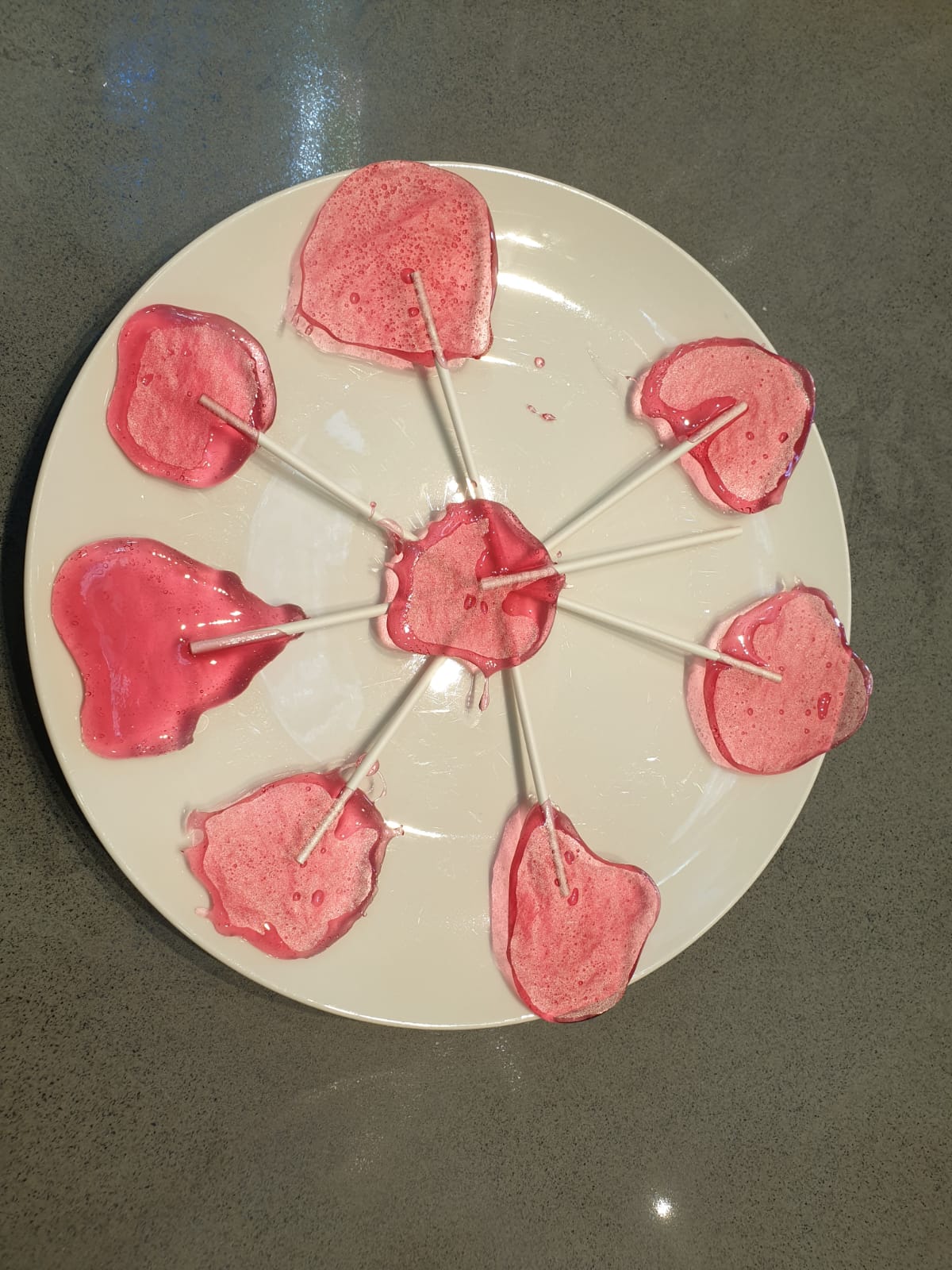 - Con una cuchara, forme círculos de caramelo sobre el papel de hornear preparado e inmediatamente, coloque palitos para piruleta presionando y dándoles un pequeño giro para que se cubran de caramelo. Deje enfriar las piruletas completamente (aprox. 10-15 minutos).