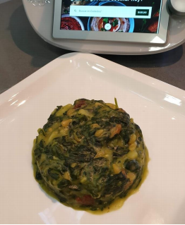 - Añada las pasas, las espinacas, la mantequilla, los piñones, la pastilla de caldo desmenuzada y la pimienta (las espinacas ocupan todo el volumen del vaso, pero bajan con la cocción). Programe 15 min/100°C/ giro inverso/ vel 1.