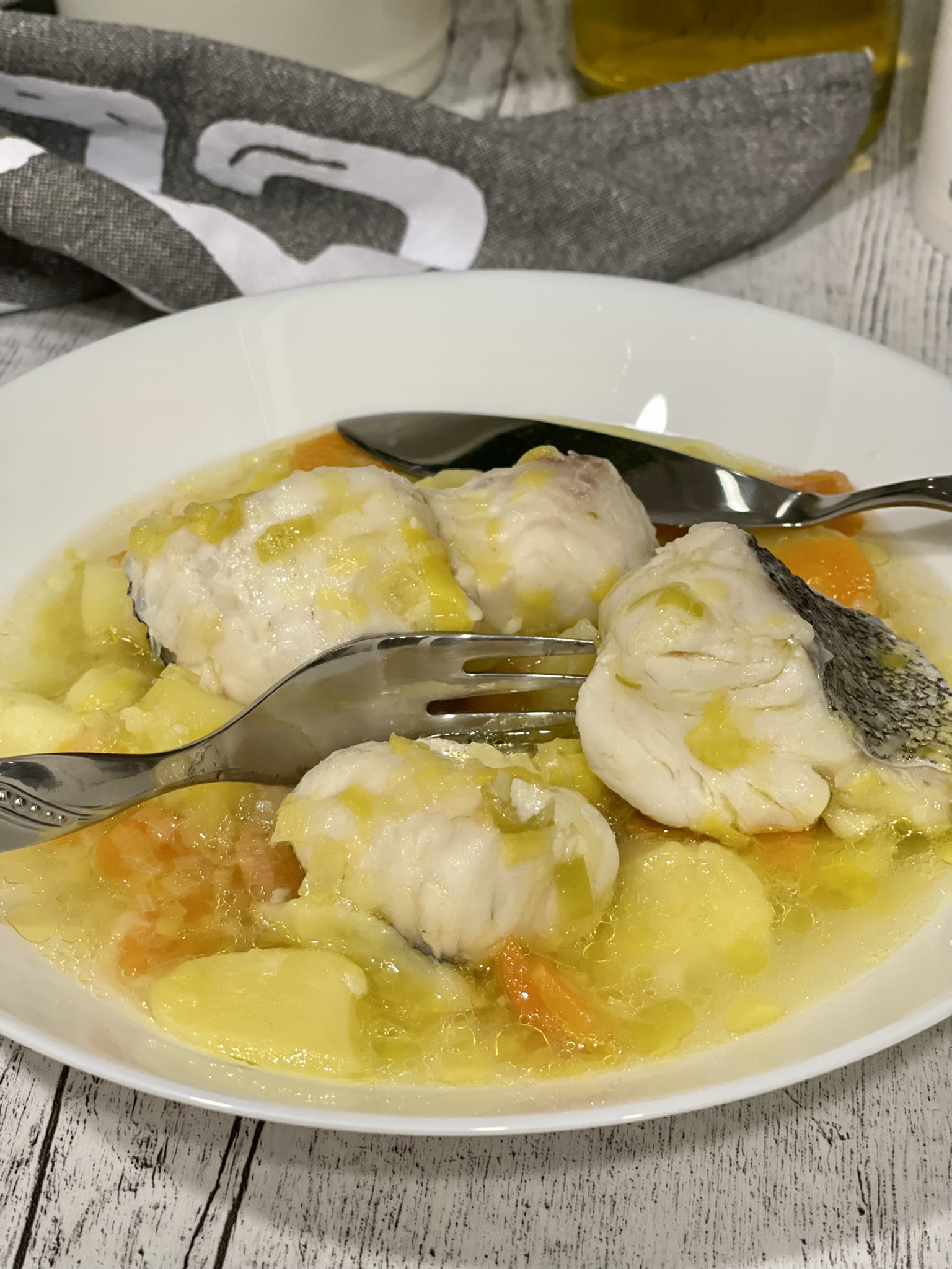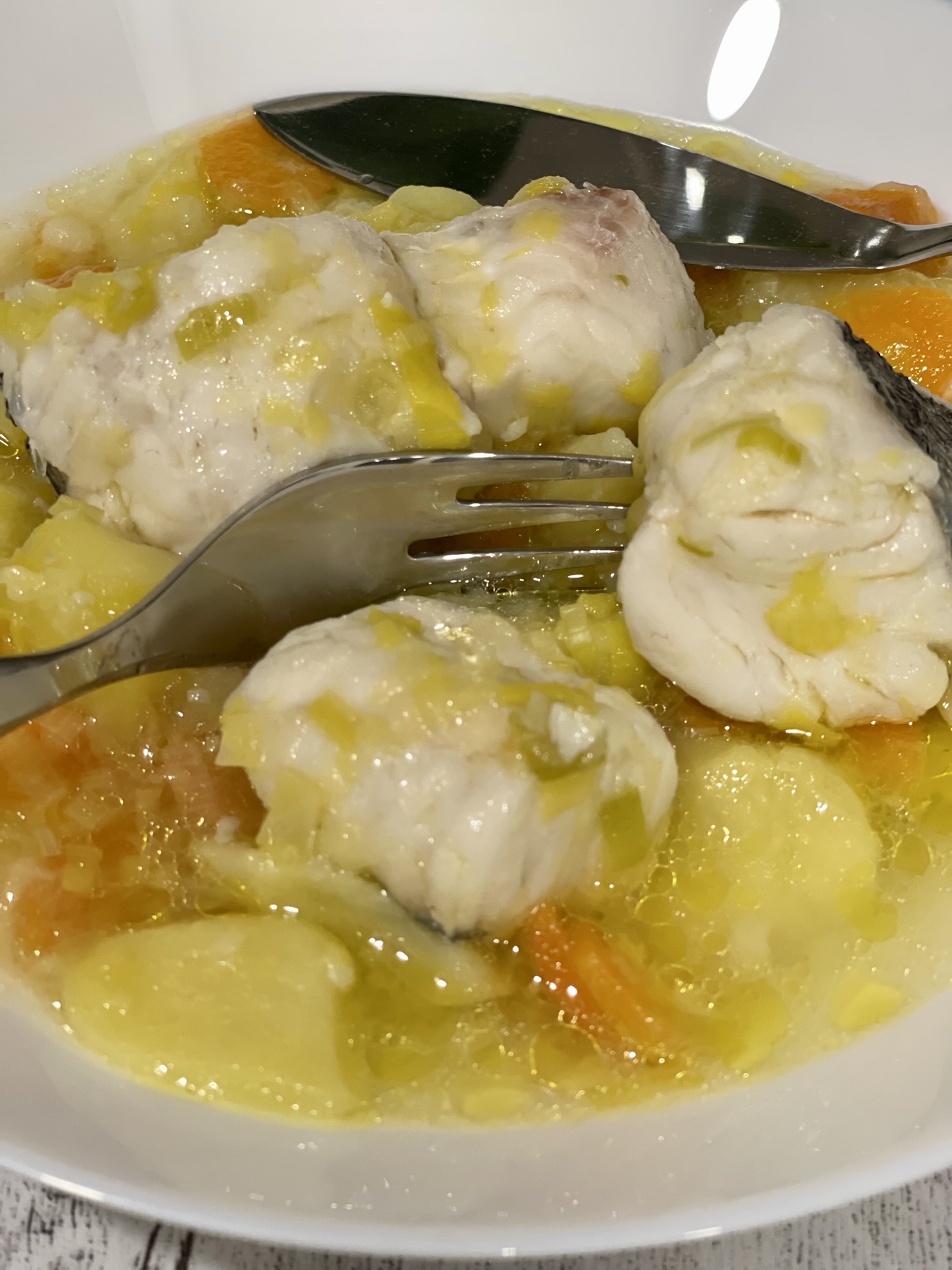 La receta que os traigo hoy está en Cookidoo pero me gusta darle mi toque personal y adaptarla a mi manera. Por ejemplo la receta pide merluza congelada y yo la hice con merluza fresca y el resultado es igualmente perfecto. También le puse menos agua, un poco menos de aceite y se me ocurre, así sobre la marcha, que a los que no os guste encontrar las verduras, podéis triturarlas antes de poner las patatas o quitar el giro inverso en el paso 1,