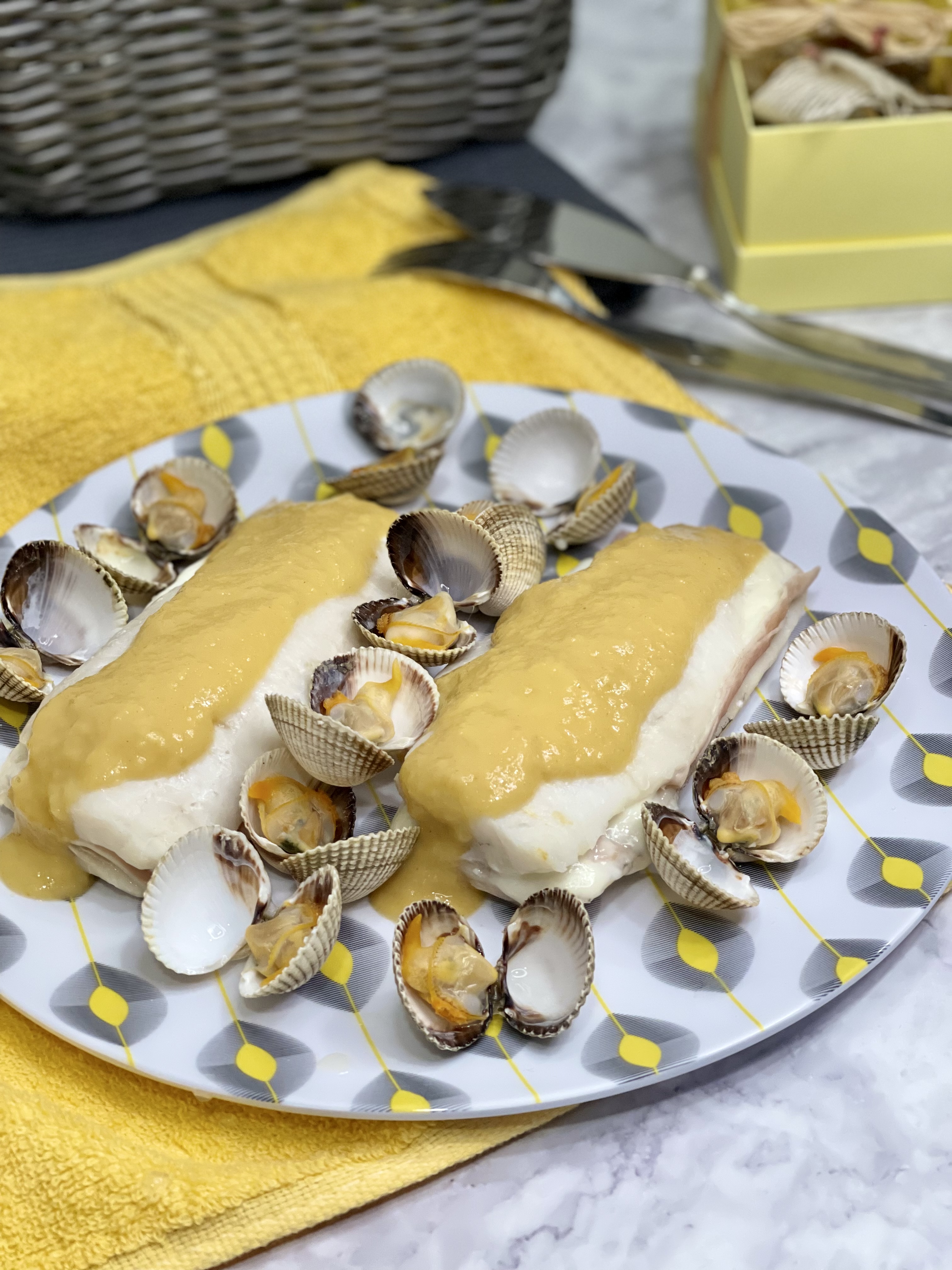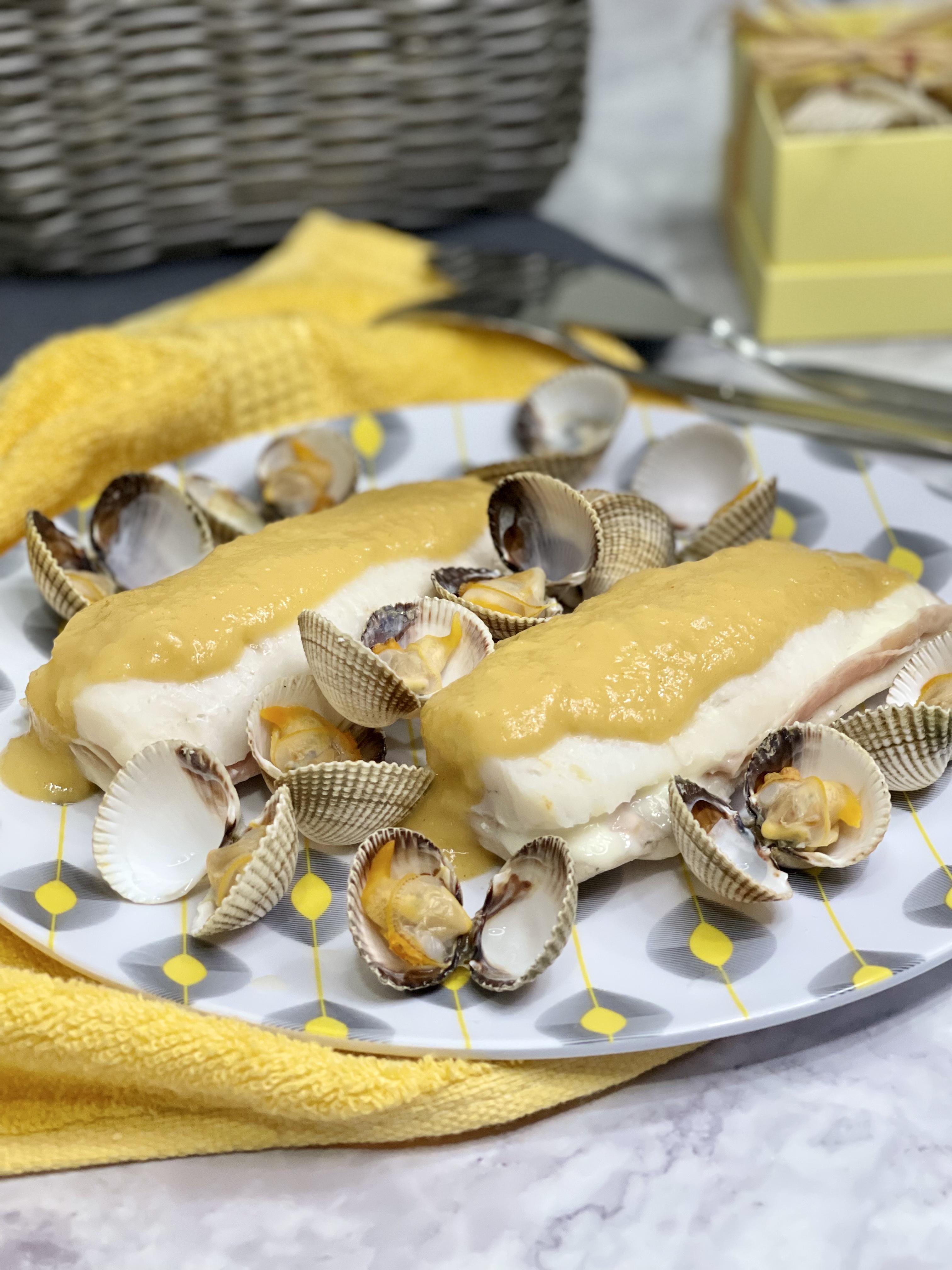 SAN JACOBO DE MERLUZA AL VINO BLANCO CON BERBERECHOS