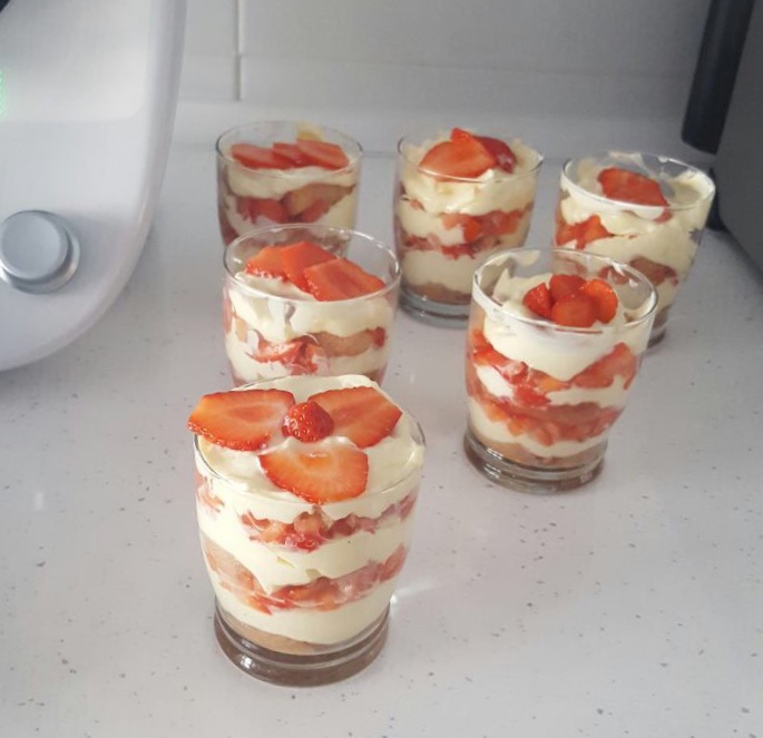 Remoje los bizcochos en la salsa de fresas fría y vaya poniendo una capa en el fondo de 8 vasos. Cubra con la crema de mascarpone y con las fresas reservadas y siga haciendo capas hasta que haya usado todos los ingredientes. Reserve en el frigorífico durante aprox. 1 hora antes de servir.