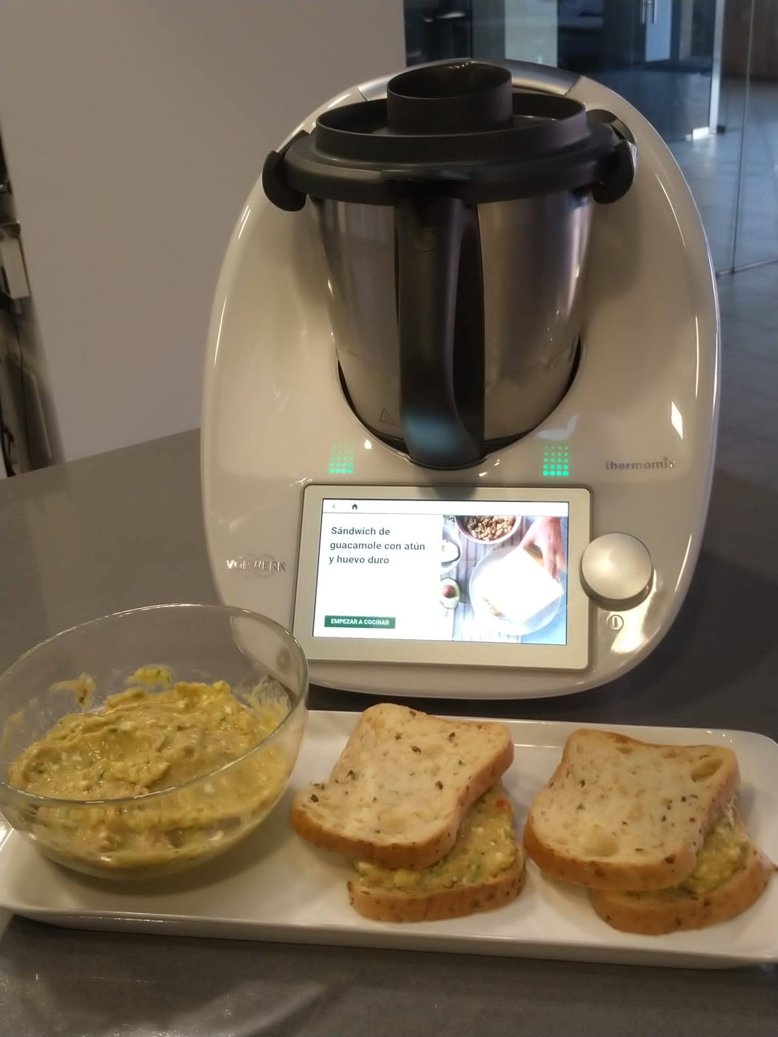 - Añada el huevo troceado reservado y el atún escurrido y mezcle 3 seg/vel 3. Reparta el guacamole en 6 rebanadas de pan de molde, tape con otras 6 rebanadas y sirva.