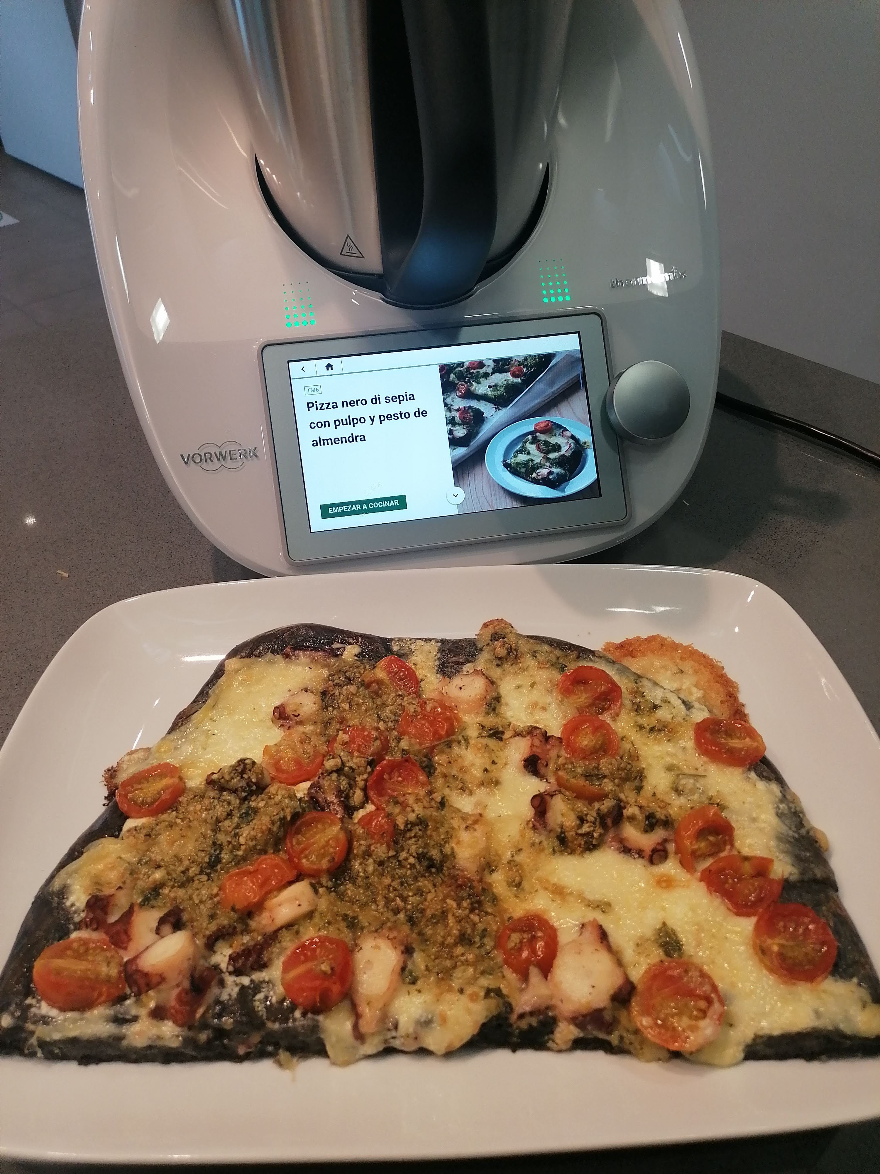 - Añada las almendras, el ajo, la albahaca, el aceite y la sal y triture 10 seg/vel 7. Reparta el pesto sobre la pizza.