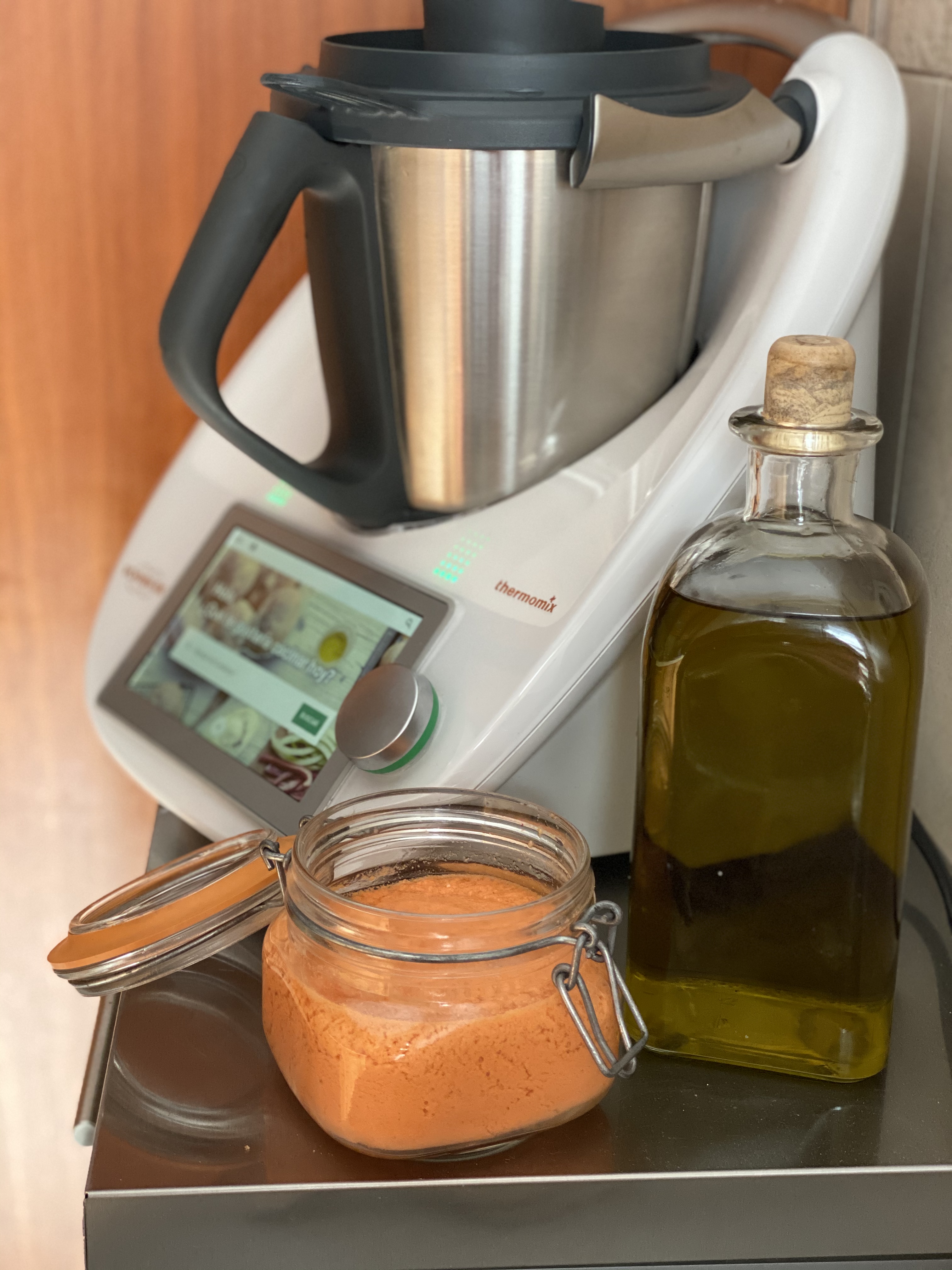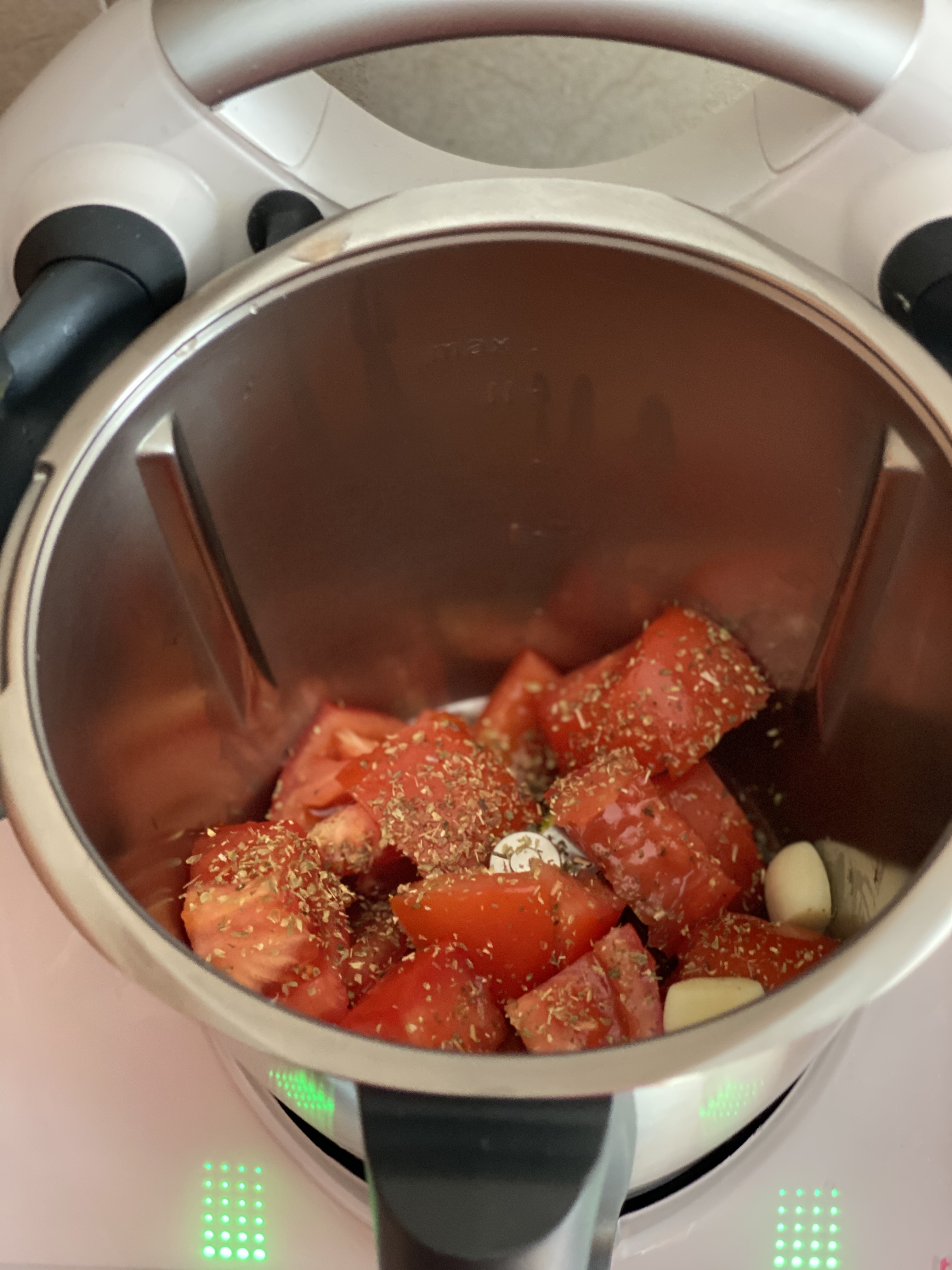 - Ponemos en el vaso el tomate, el ajo, el aceite y el orégano (al gusto) y trituramos 30 seg/vel prog 5-10