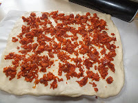 - Estiramos la masa y añadimos el chorizo picado