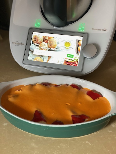 - Vertemos la salsa sobre los pimientos y horneamos a 180º durante 10 minutos.