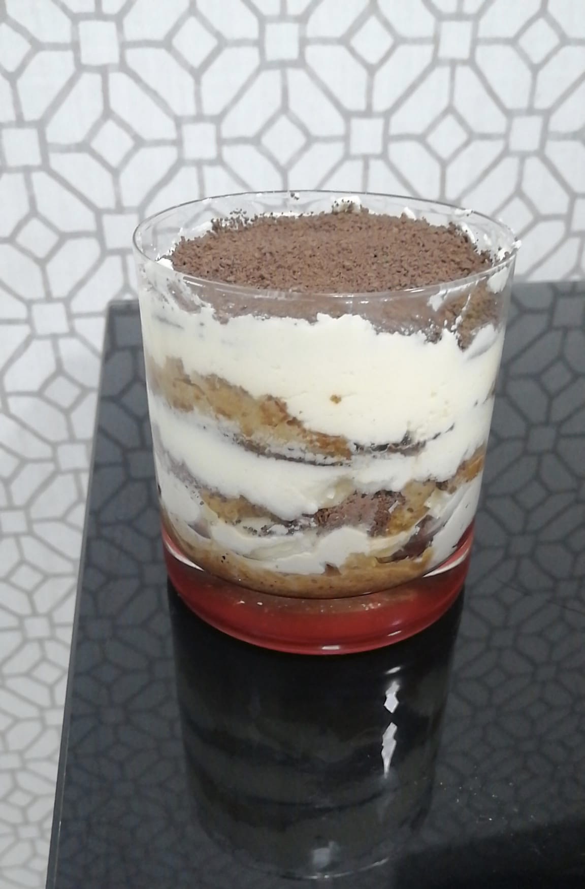 - Remojamos brevemente los bizcochos de soletilla en el café frío, lo justo para que se empapen sin romperse. Colocamos la mitad de los bizcochos con café en el fondo de una fuente o como en mi caso en vasos individuales. Extendemos la mitad de la mezcla del Mascarpone sobre la base de los bizcochos. Cubrimos con los bizcochos remojados restantes y extendemos el resto de la mezcla de Mascarpone encima. Cubrimos con film transparente y refrigeramos durante 5 horas. Espolvoreamos con cacao en polvo justo antes de servirlo.