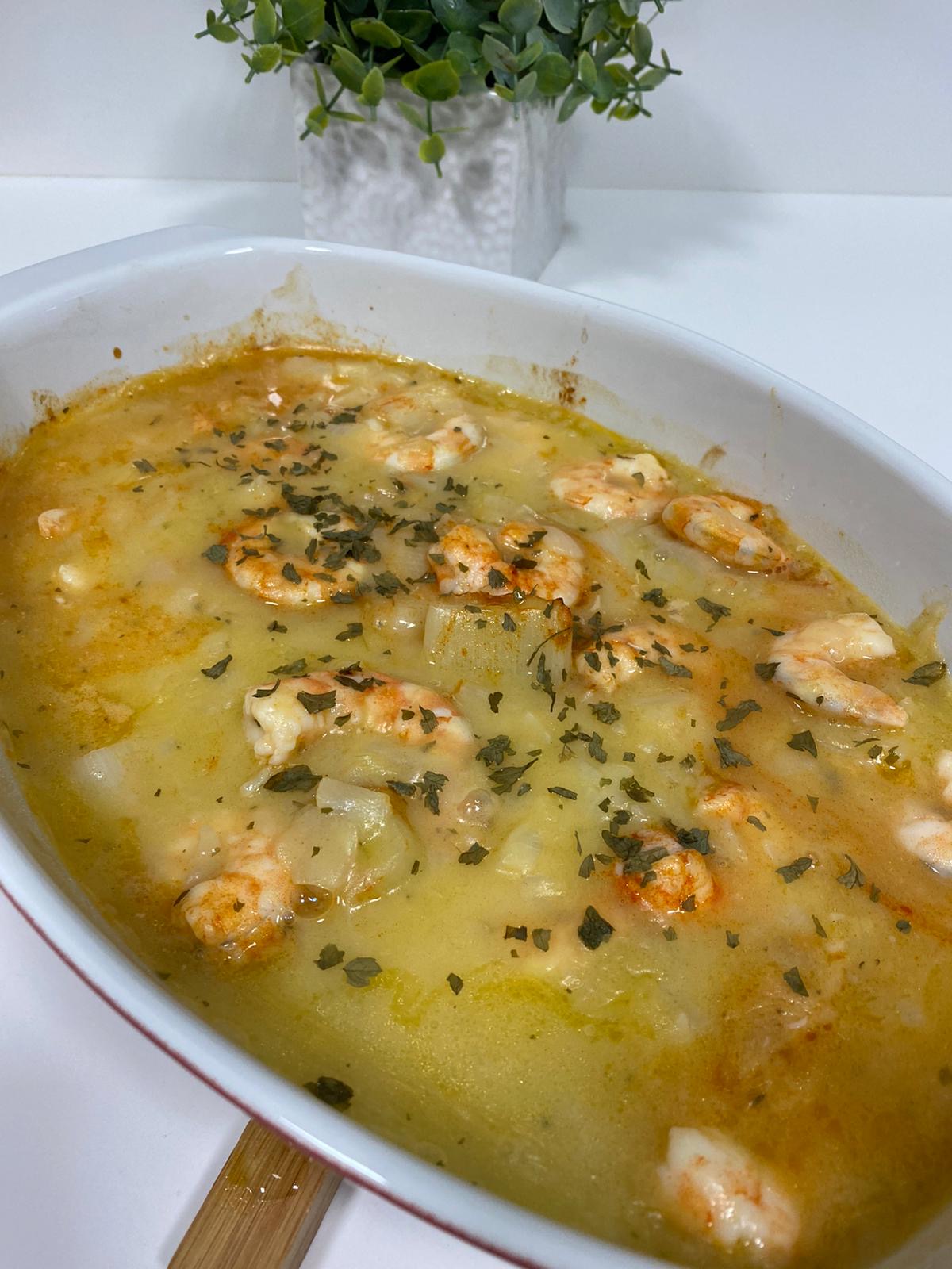 - Añadimos el caldo y programamos 10 min / 100º / vel 2. Mientras tanto, colocamos en una fuente de horno los puerros del Varoma y los langostinos. Vertemos la salsa encima.